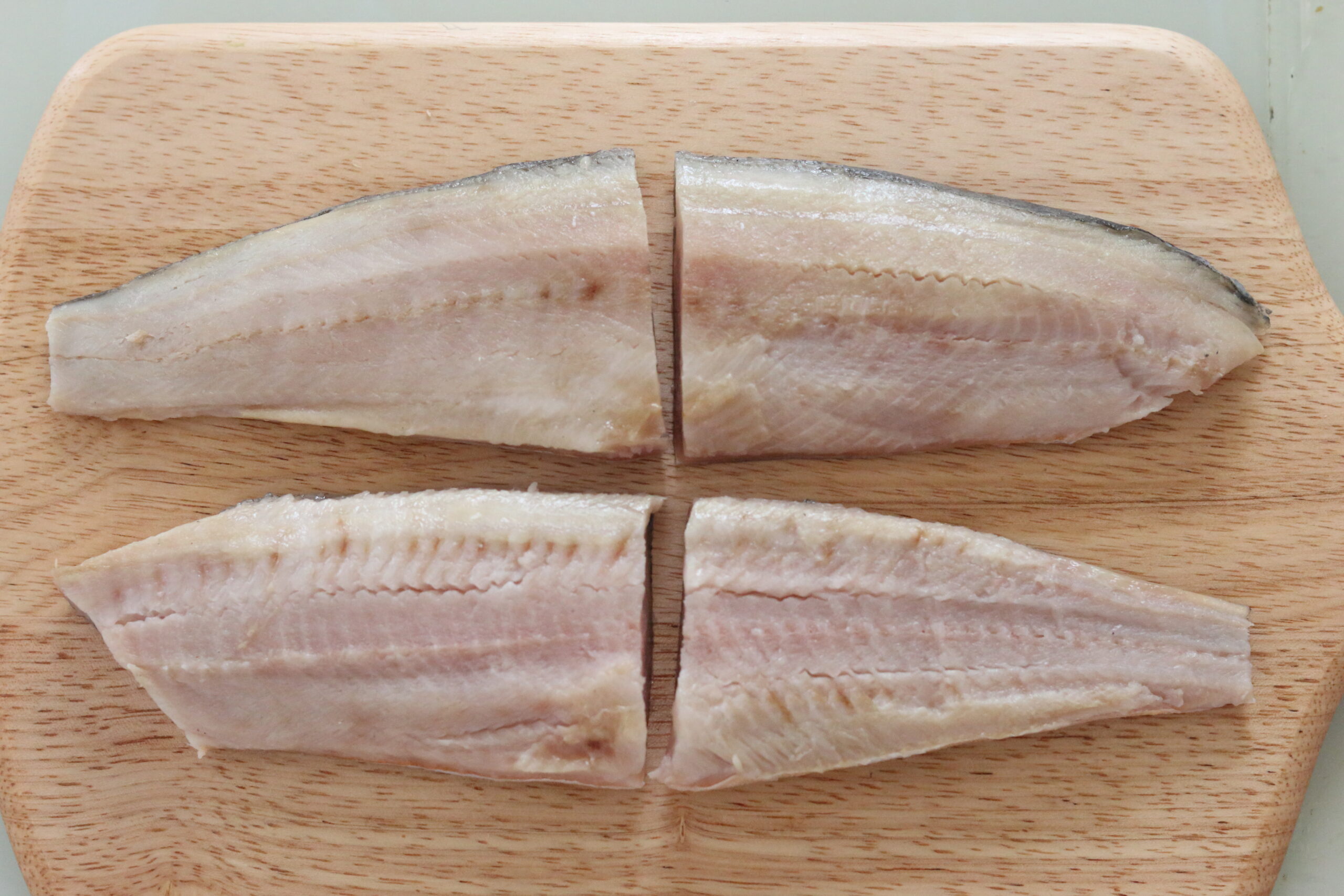 ① 灰干しホッケを解凍し、頭、尾ひれ、骨を取り除き、4枚の切り身に分けます。