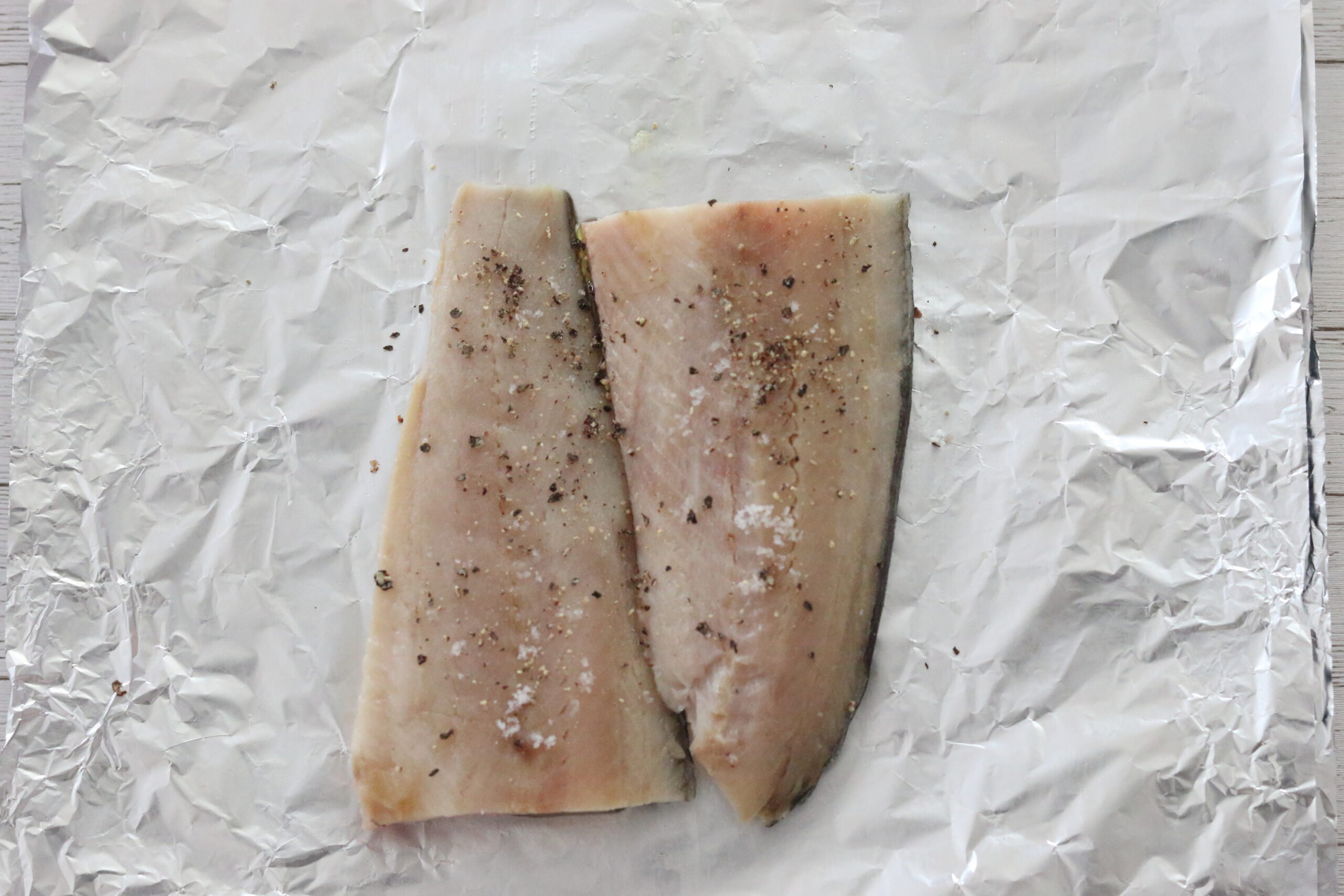 ② 30cm前後のアルミホイルを広げ、中央にオリーブオイル(小さじ1)を薄く塗ります。灰干しホッケの切り身を2枚のせ、塩と黒こしょうをふりかけます。