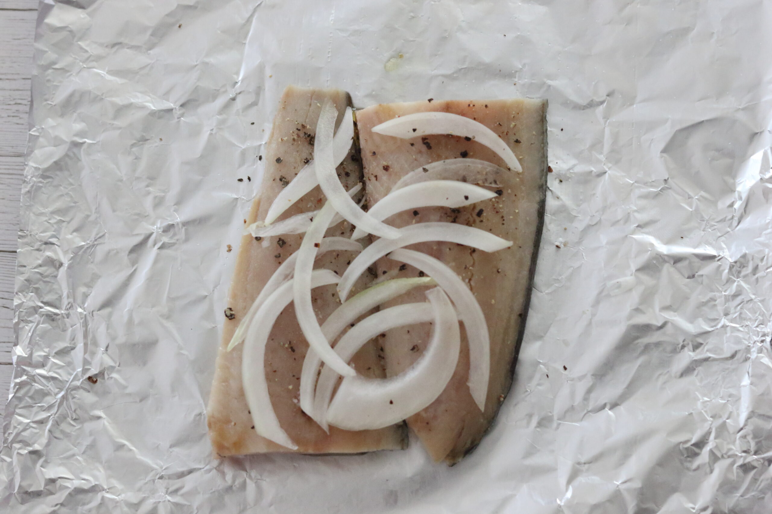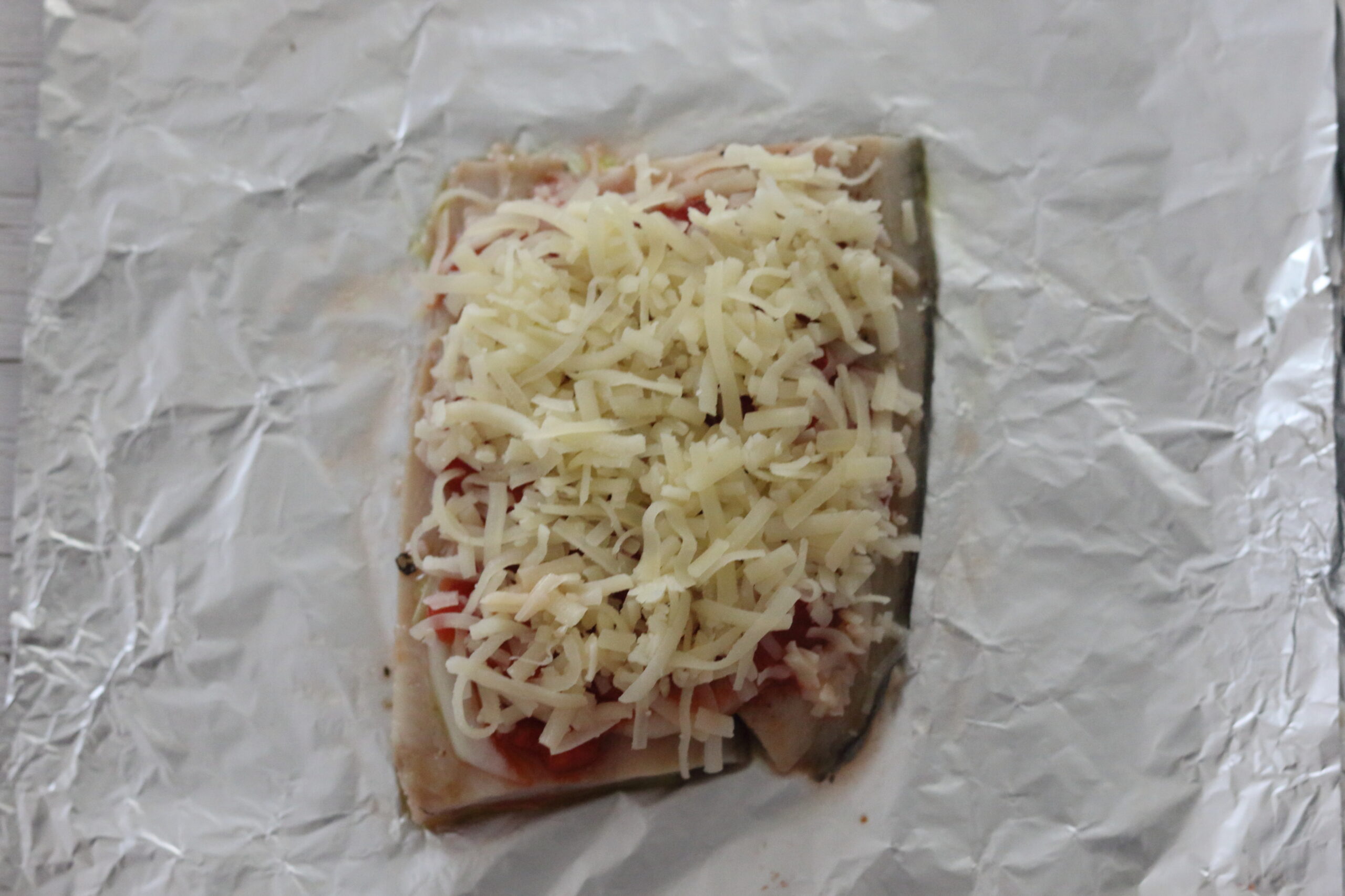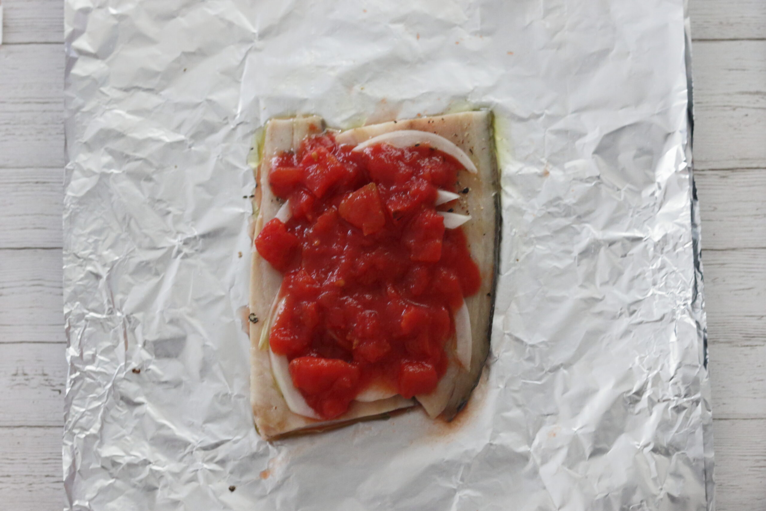 ③ 切り身の上に薄切りの玉ねぎをのせ、さらにオリーブオイル(小さじ1)を回しかけます。次にカットトマトとピザ用チーズを順にのせ、アルミホイルで包みます。同様にもう1つ作ります。