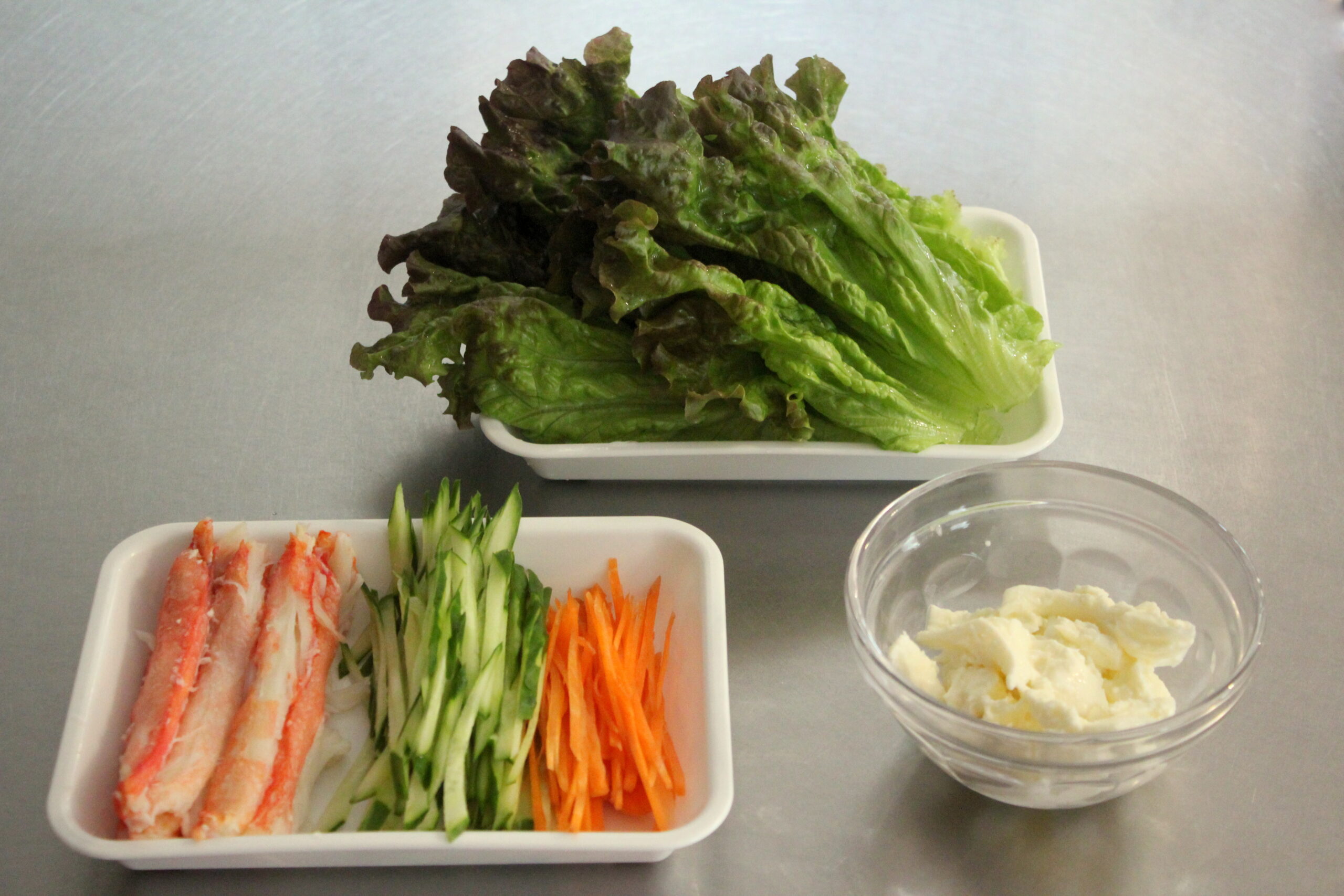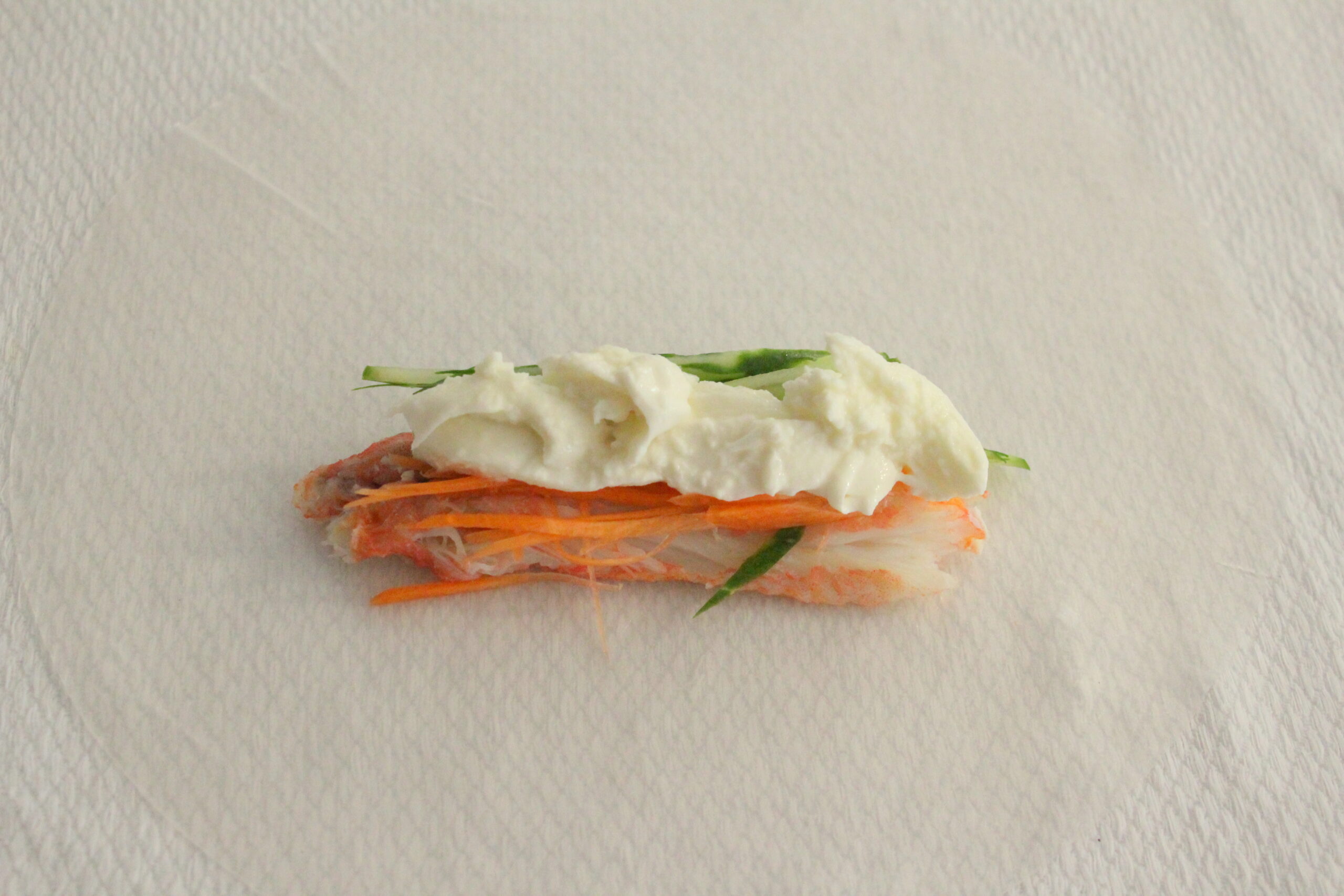 ⑨カニの上に同じく1/4量のきゅうり、人参、モッツァレラチーズを重ねます。