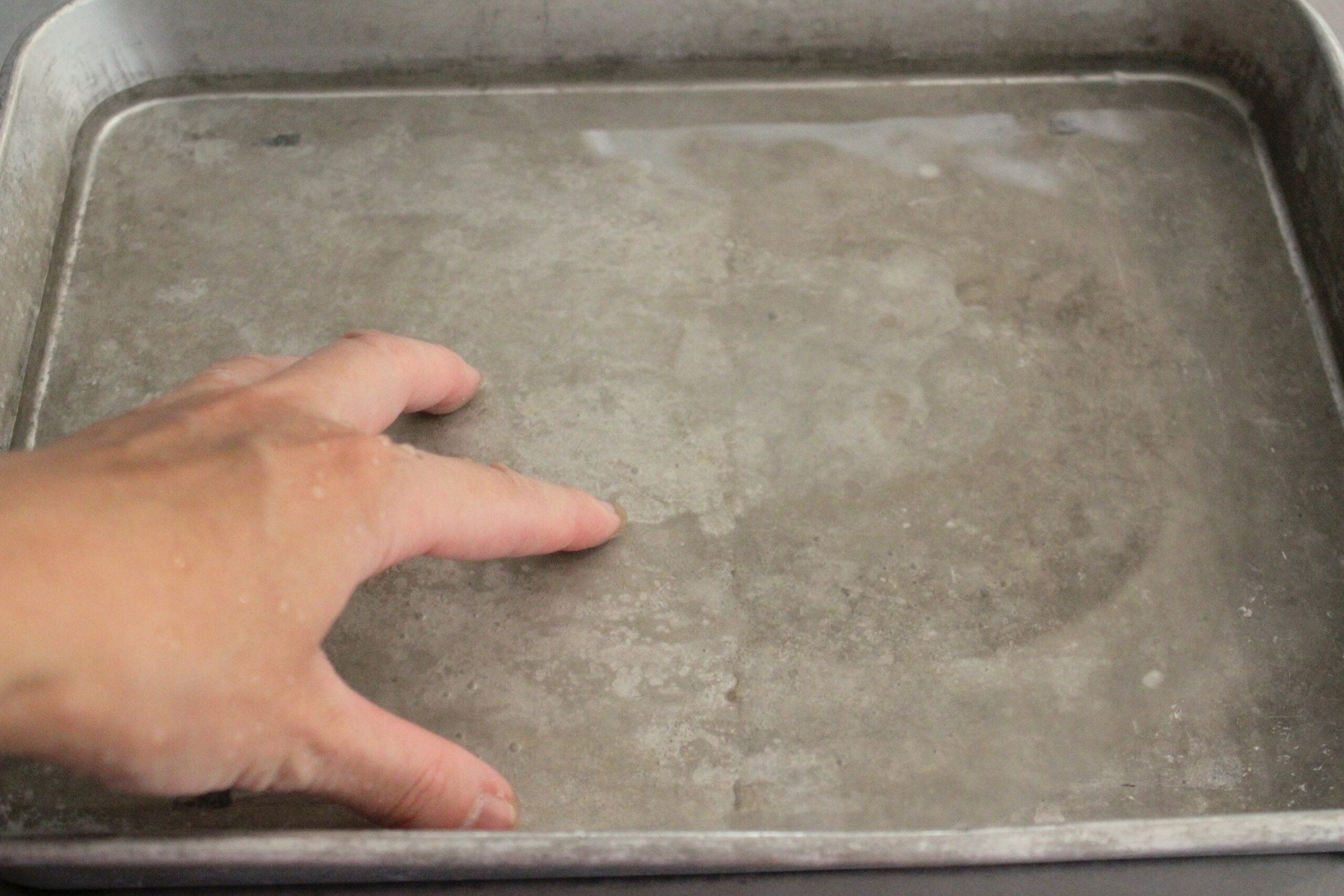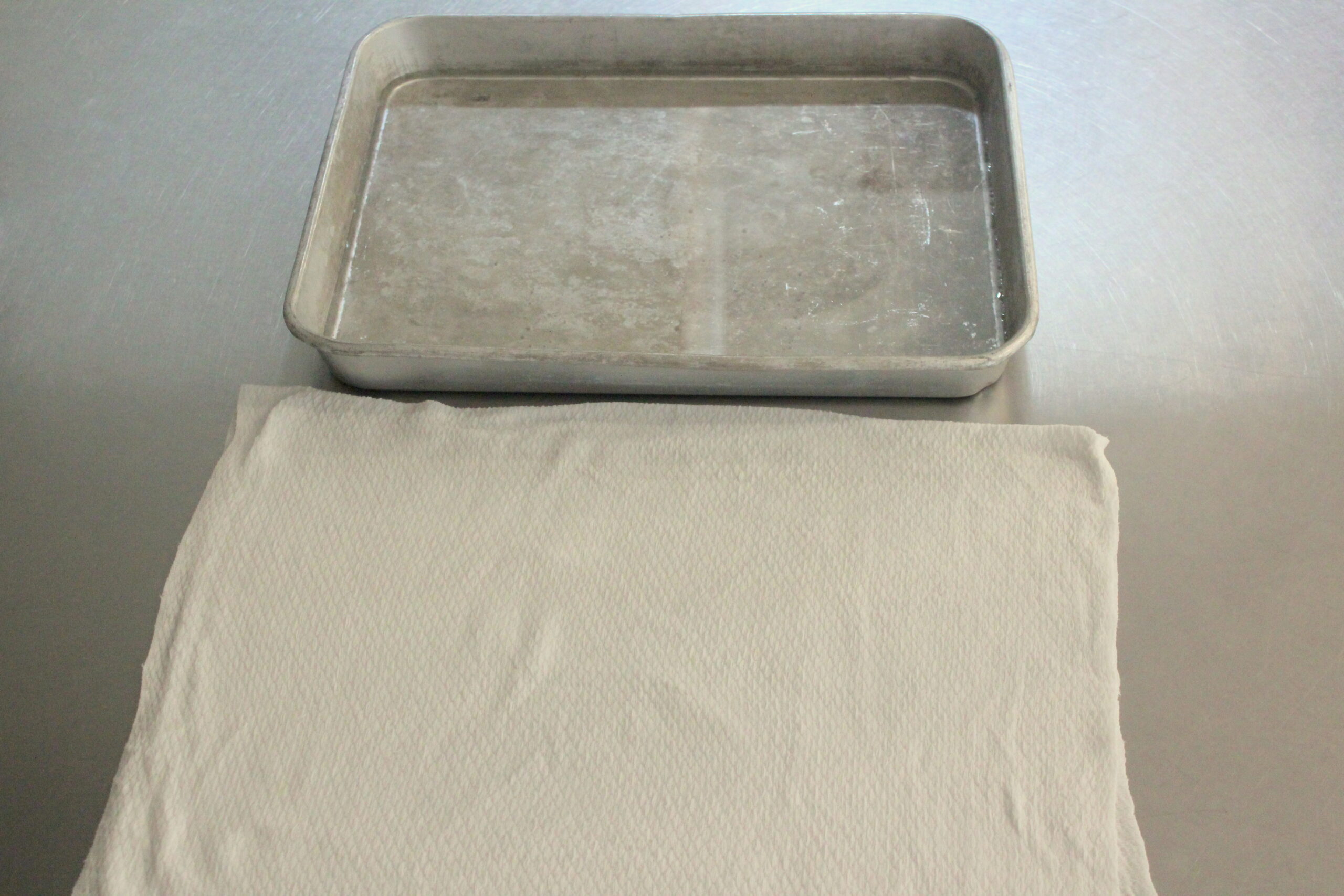 ⑤水かぬるま湯を張ったバットと、固く絞った布巾を用意します。