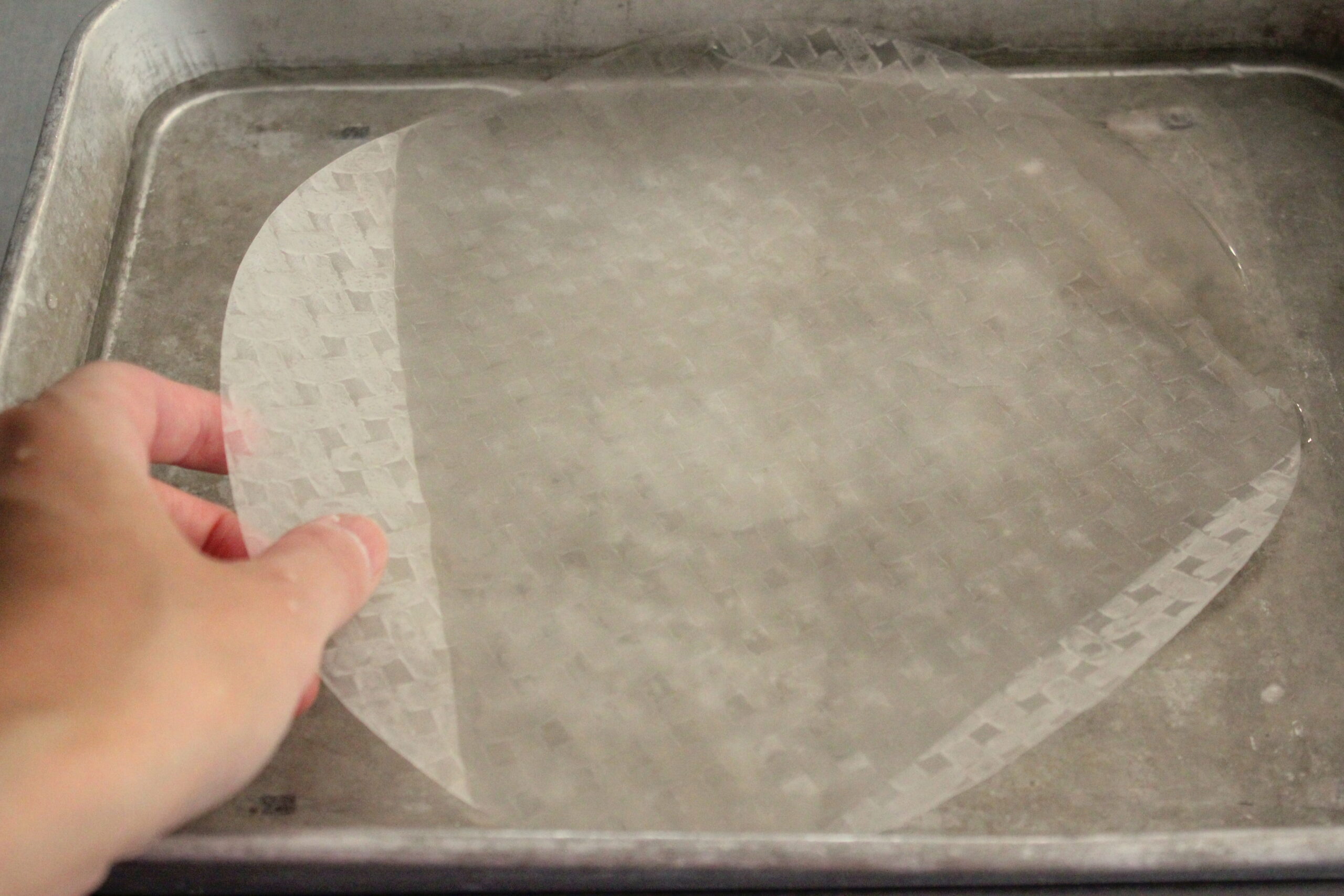 ⑥ライスペーパーの凹凸がある方を上にしてバットに浸し、手で押さえながら柔らかくなるまで戻します。