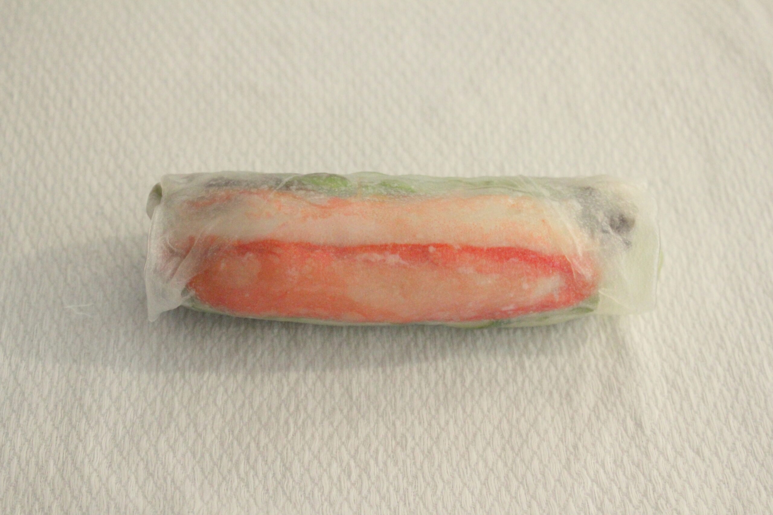 ② ライスペーパーは破れやすいので力加減にきをつけつつ、具が崩れないようにきつめに巻くのがポイントです。