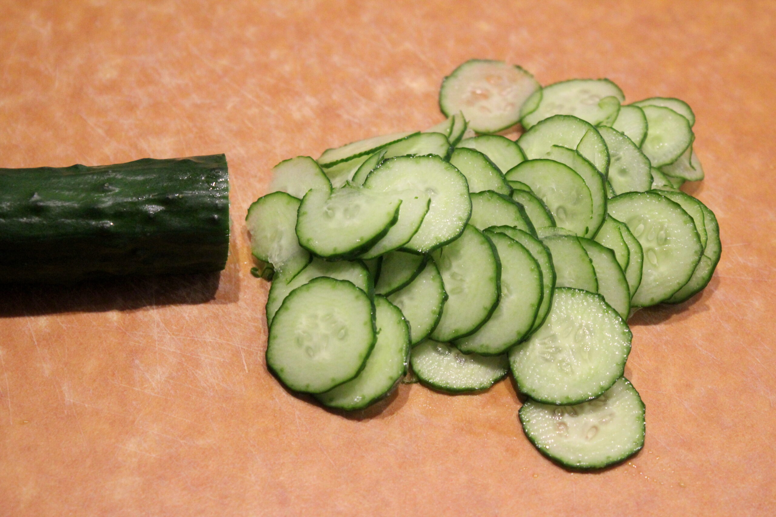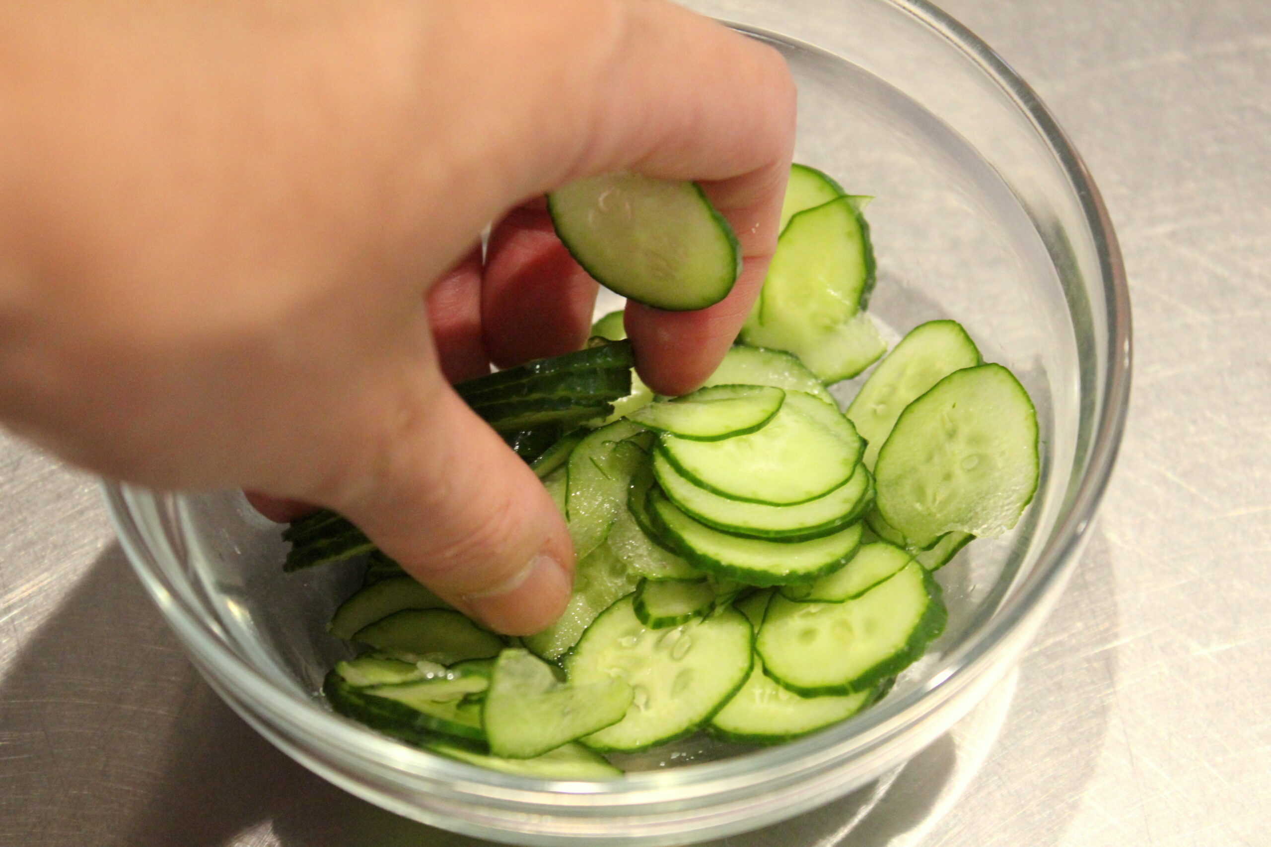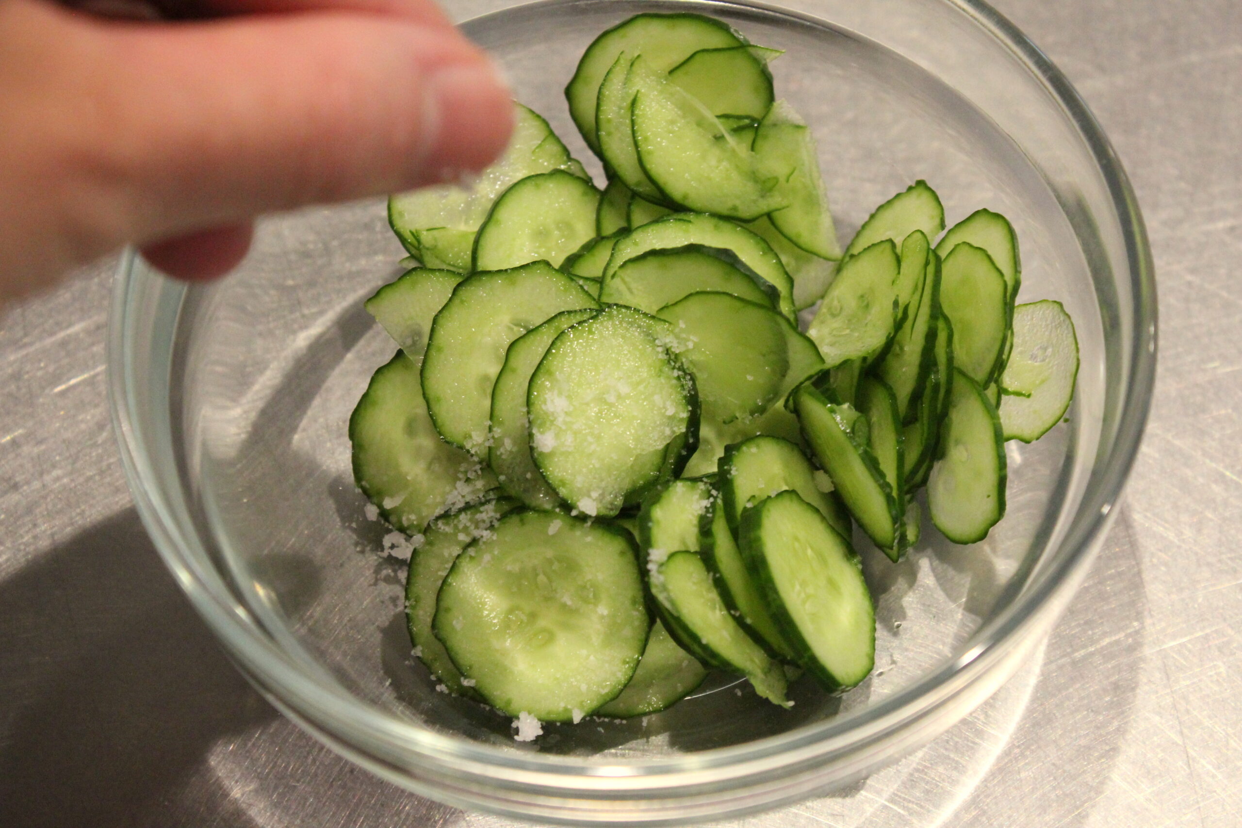 ②きゅうりは薄い輪切りにし、塩をもんで5分ほどおきます。
