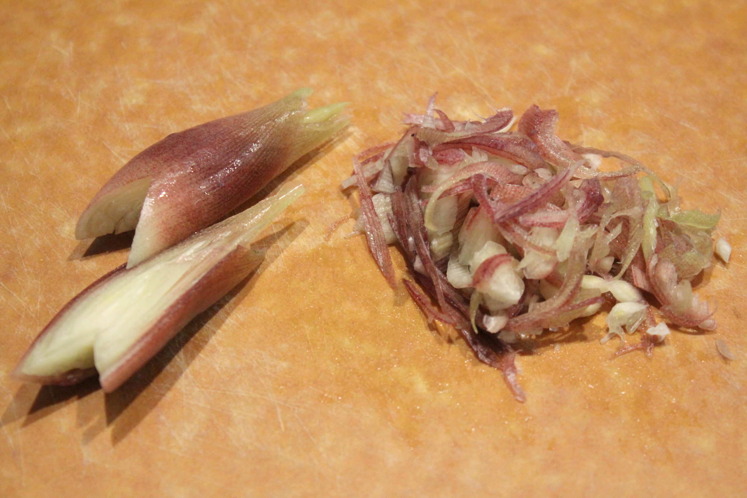 ③みょうがは縦半分に切って芯をV字に切り取り、斜め薄切りにします。