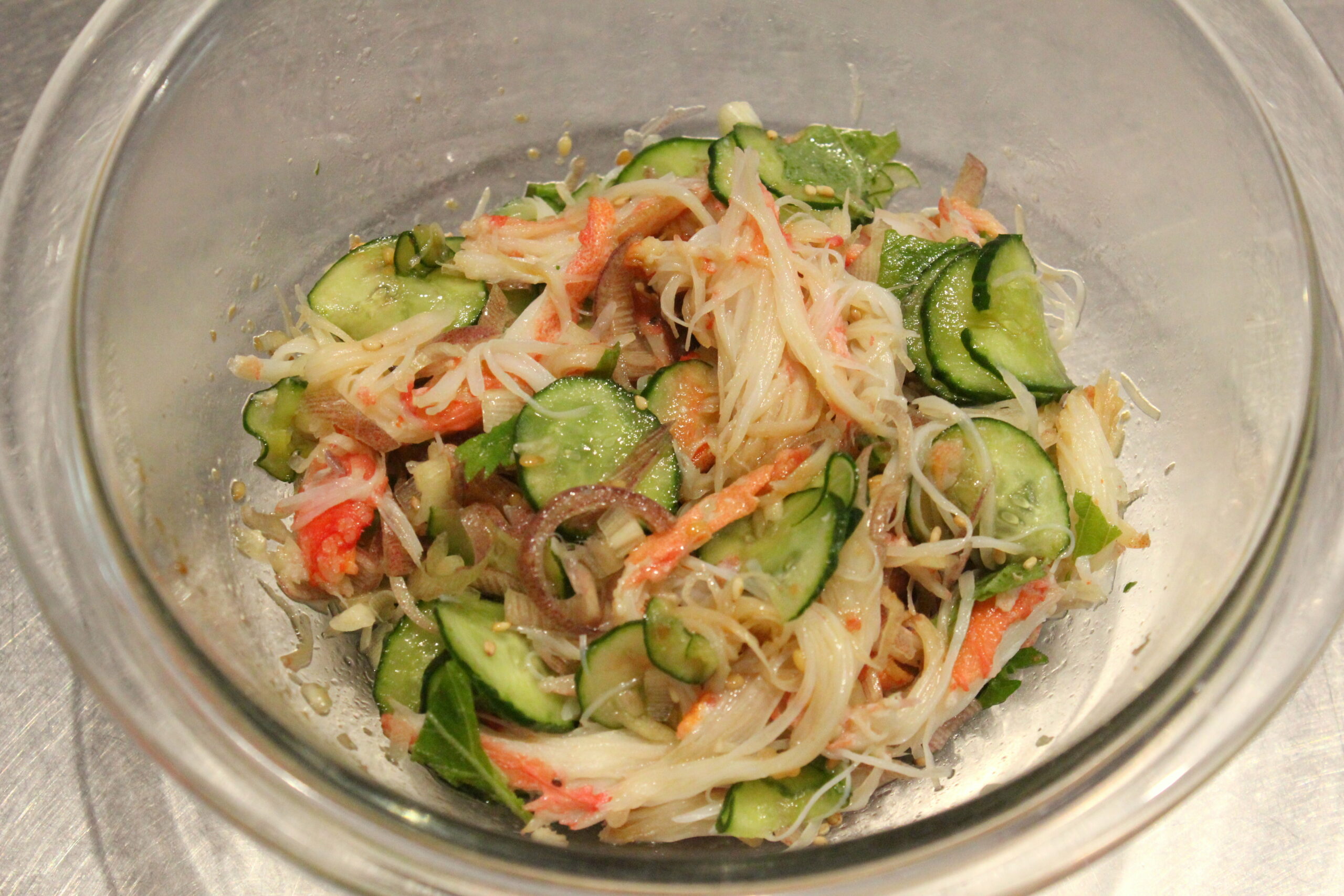 ⑥きゅうりをよく手でしぼって水気を切り、みょうが・大葉・カニの足と共にボウルに加えて和えます。