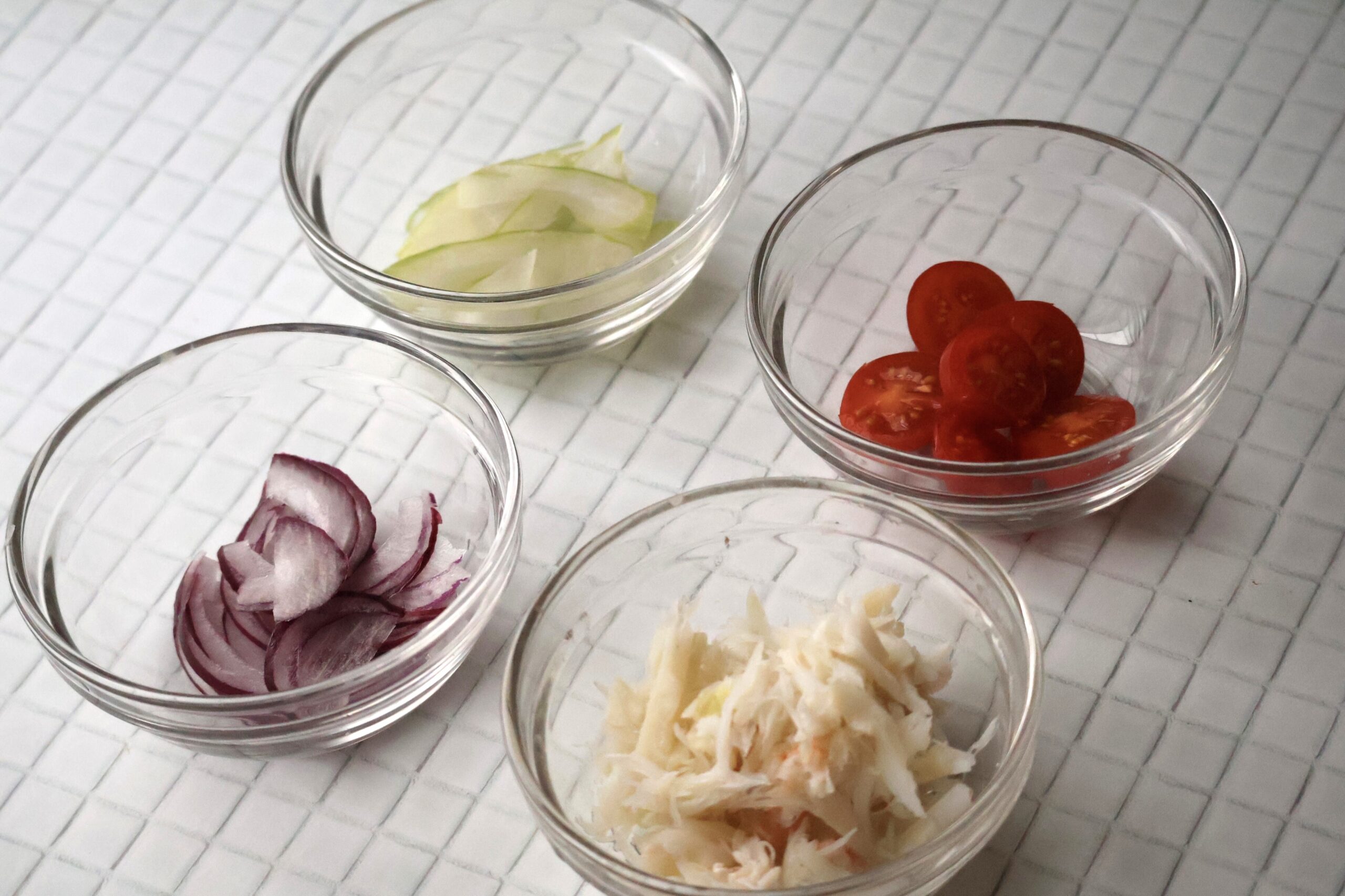 ②ミニトマトは半分にカット、紫玉ねぎは薄切り、セロリは斜めに薄切りにしておきます。