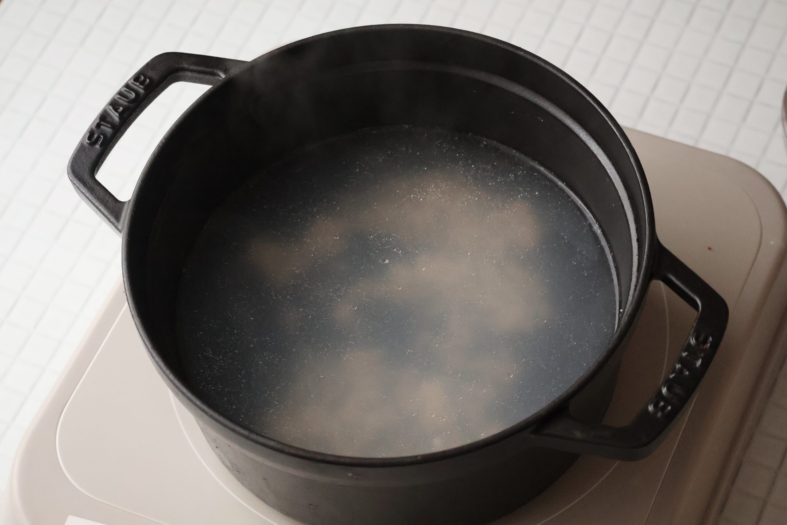 ④ 沸騰したお湯に緑豆春雨を加えて、既定の時間までゆで、ざるにあげて冷水でしめます。そのゆで汁に豚ひき肉をほぐしながら加え、火を通し、ざるにあげます。