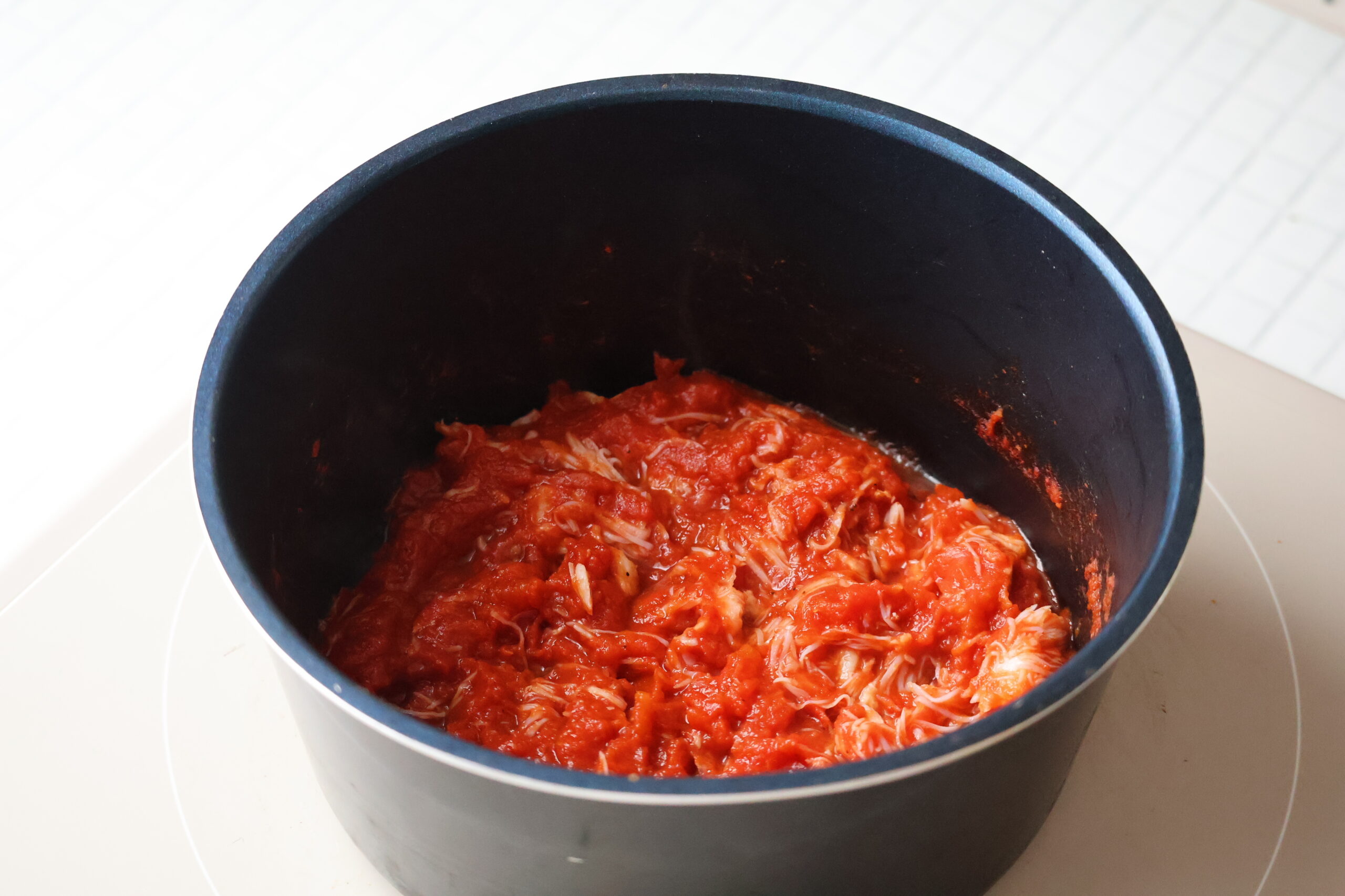 ② 小鍋にトマト缶と1の本ズワイガニ、にんにく、ブラックペッパー、砂糖を加え、トマト缶の水っぽさがなくなるまで、かき混ぜながら火にかけます。