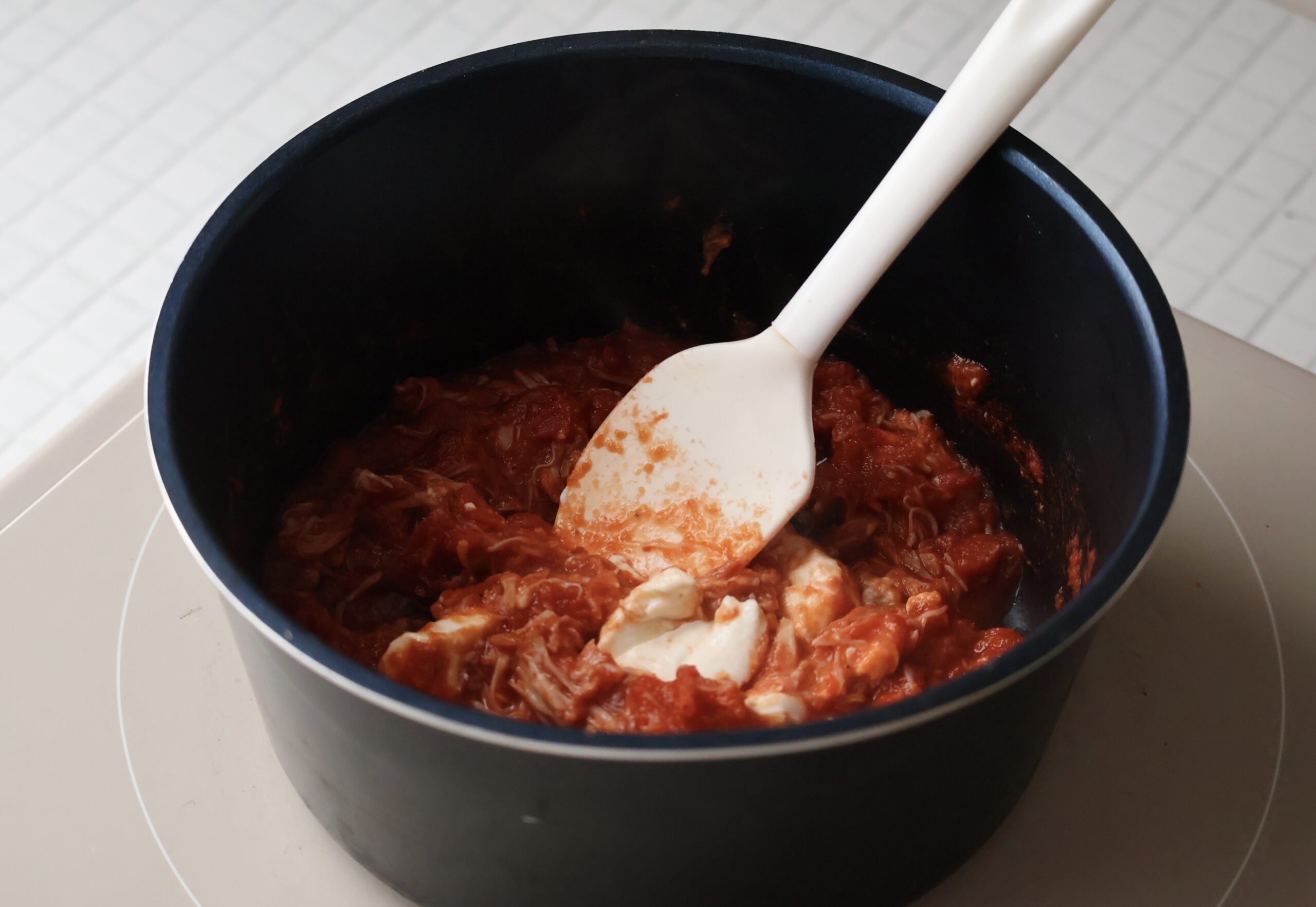 ③ 火からおろし、クリームチーズを加えてゴムベラで混ぜます。よく混ざったらレモン果汁も加えてさらによく混ぜます。