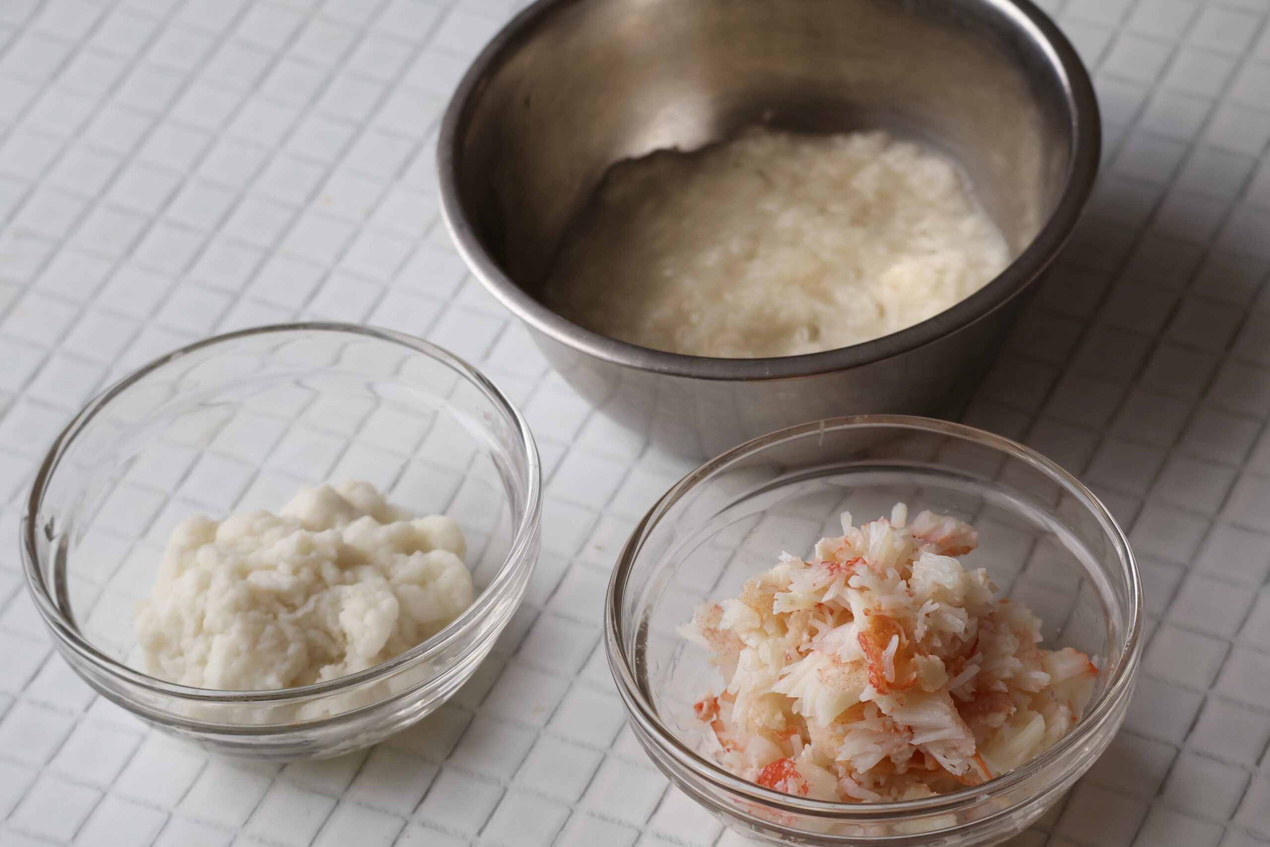 ①山芋はすりおろし、本ズワイガニは手で細かくみをほぐす。はんぺんは潰しておく。