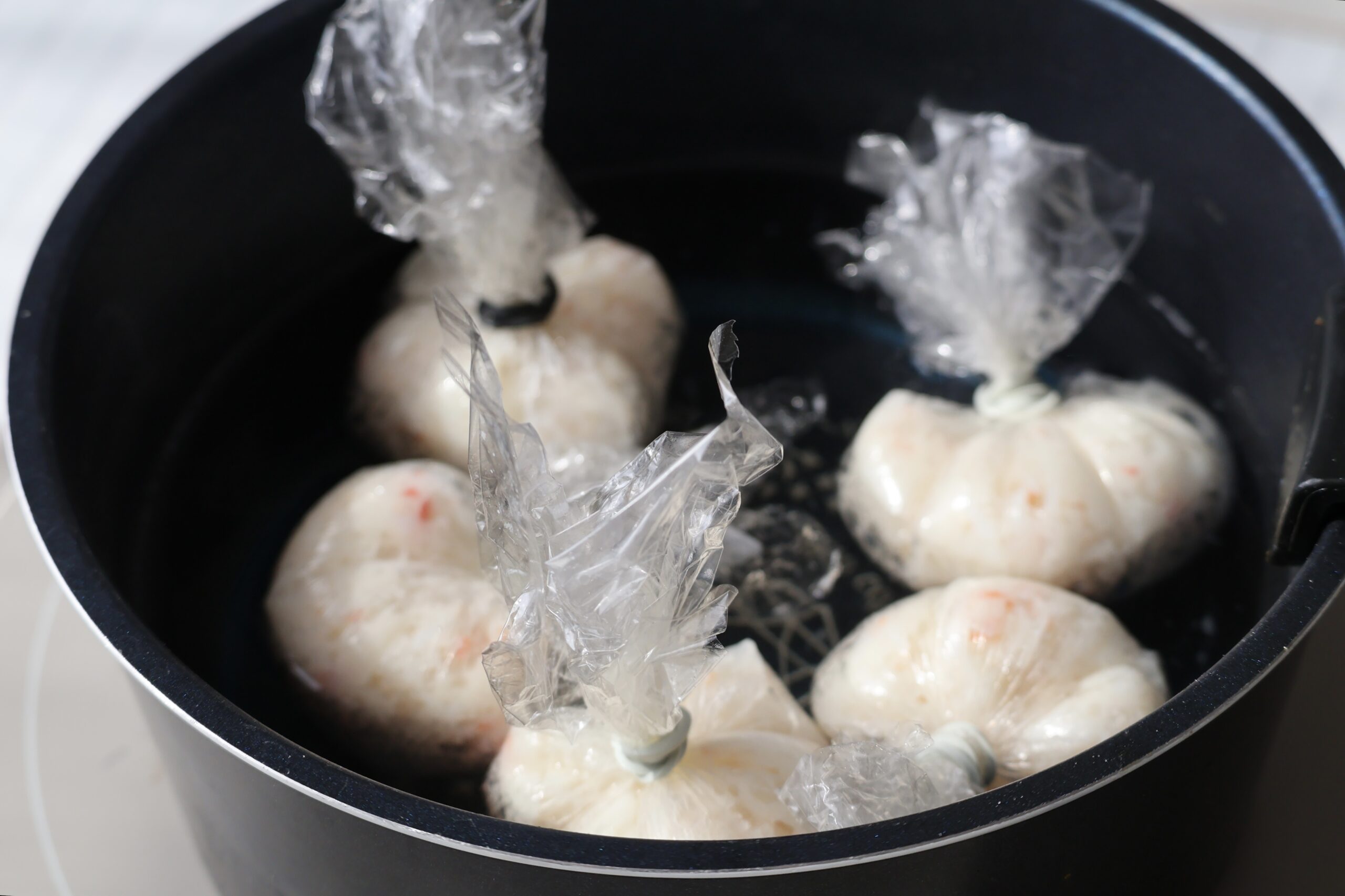 ② Aの材料を加えて良く混ぜ、6等分にしてラップに包んで茶巾に絞り、熱湯に入れて茹でる。水にラップごととり、しっかり冷ます。(ラップがほどけてしまう場合は輪ゴムで止めてもOKです)